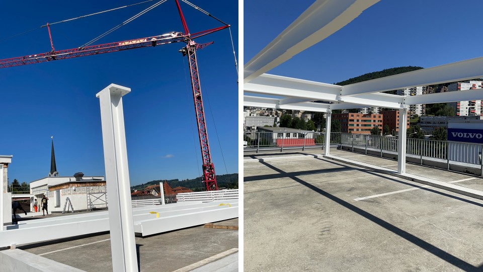 - August 2022: Der Stahlbau wurde montiert.